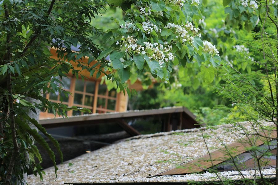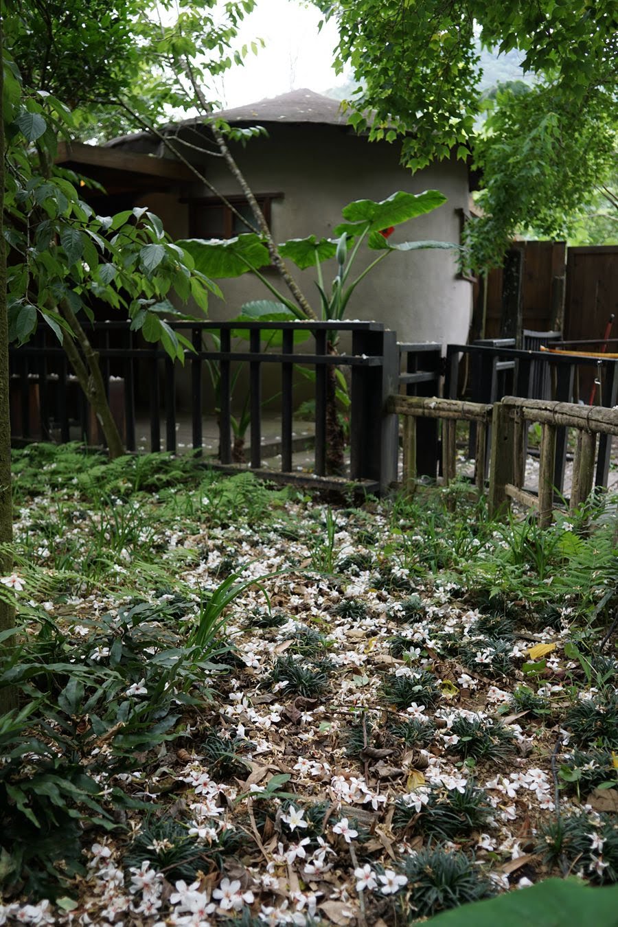 小屋周邊飄下了片片油桐花