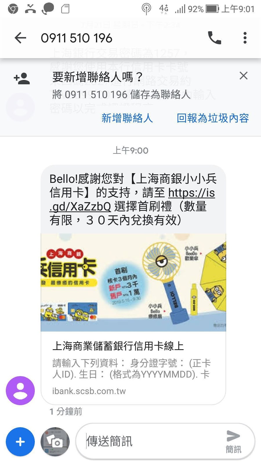 2019.07.31收到上海銀行傳來的小小兵信用卡首刷禮兌換簡訊通知
